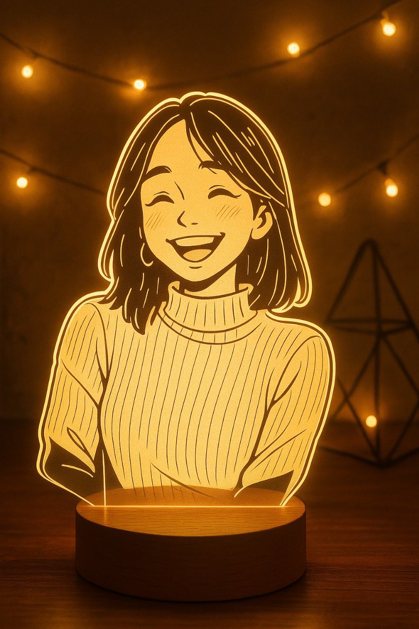 An illuminated 3D lamp featuring (the photo attached), captured in an illustrated style. The lamp stands on a (wooden base, glowing softly in a cozy, warm setting with string lights) and a (modern decorative element) in the background. The illustration shows a young (girl) in (casual attire) wearing the same in the attached photo smiling joyfully. The scene is (light and heartwarming, evoking a romantic, playful) atmosphere.
