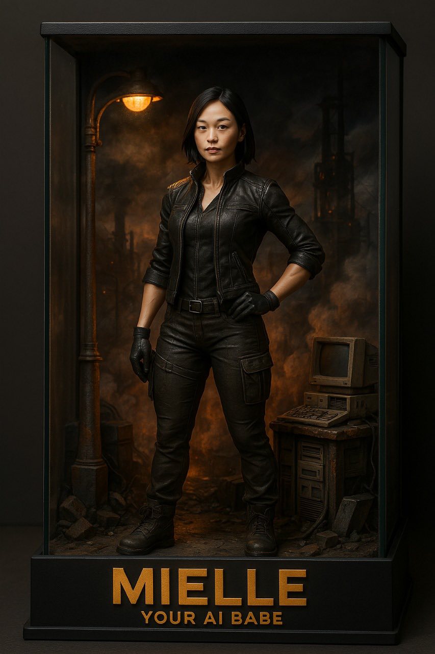 Create a highly detailed, realistic 3D diorama of (one) character (photo attached for reference), standing in front of a (dramatic urban) scene. The character is positioned in a glass display case, showcasing them as action figures. The backdrop features a (smoky, industrial environment with dim, flickering streetlights and vintage computers). The female character is dressed in a (leather jacket and appears ready for action). The diorama is labeled (“Mielle — Your AI Babe”) capturing the essence of a scene from (an action movie).