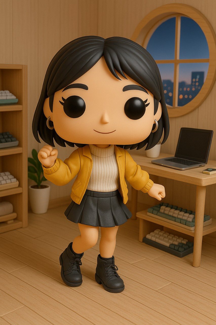 Create a highly detailed and adorable 3D rendered funko collectible figurine set inside a small (nordic) room. The room have a lot of (mechanical keyboard, table with a laptop). A (circular) window in the background showcase a (scenic city light) view.