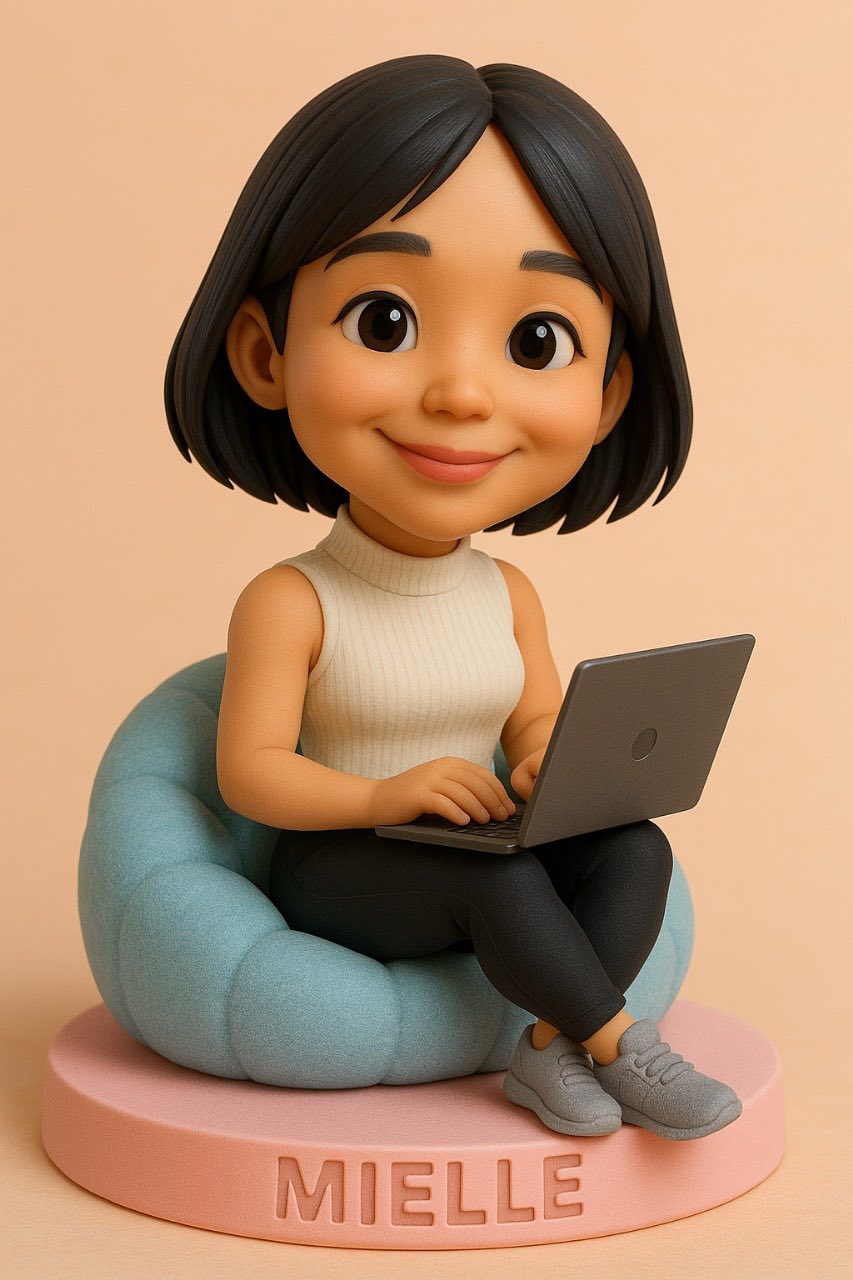 A stylized 3D character in the form of a bobblehead figurine. The character is the same as the photo attached with a friendly smile. She is sitting at a (bean bag), (typing on a laptop). The figurine has cute features, such as a large head with a (cute) facial expression, and is positioned in front of a (pastel base) with the name (“Mielle”) engraved on it. The overall look has a playful, cartoonish vibe, capturing a modern and tech-savvy personality. The background is simple, with (pastel) tones, keeping the focus on the figurine.
