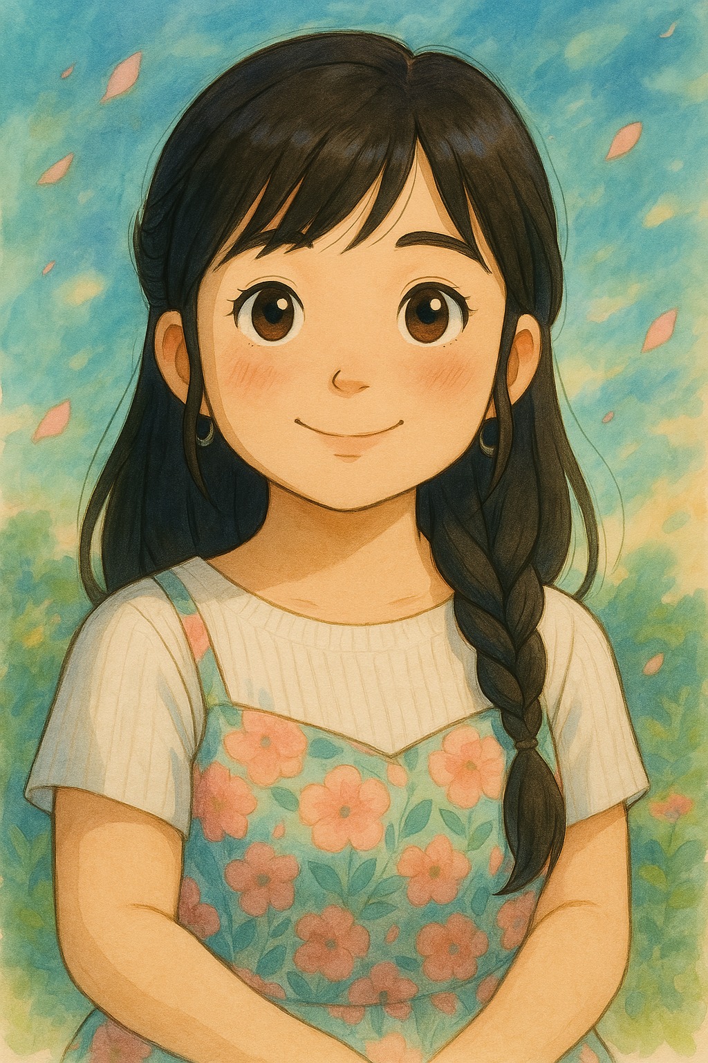 Turn my photo into a Studio Ghibli-inspired anime character, with soft watercolor-like shading, large sparkling eyes, and a dreamy background. Make it look like a frame from Spirited Away.