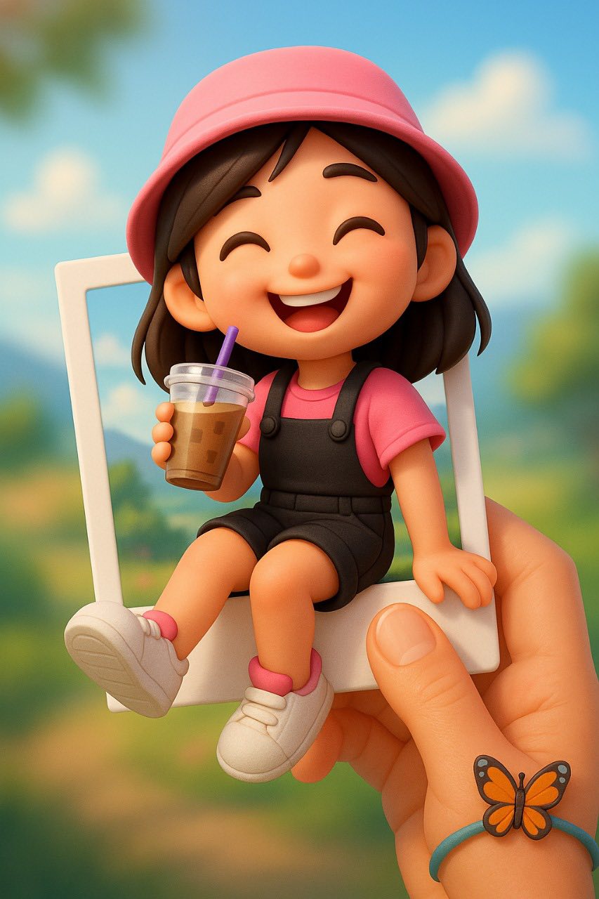 A cute, stylized 3D character of a young (girl) wearing a (pink shirt, black overalls, and a pink hat, holding a cup of iced coffee with a purple straw) (photo attached as reference). The character is playfully sitting on the edge of a polaroid-style photo frame, with one of her legs dangling outside of the photo. The background features soft scenic view, and the hand holding the polaroid is adorned with a (butterfly) bracelet. The character has an expressive, cheerful face, adding to the playful nature of the scene.
