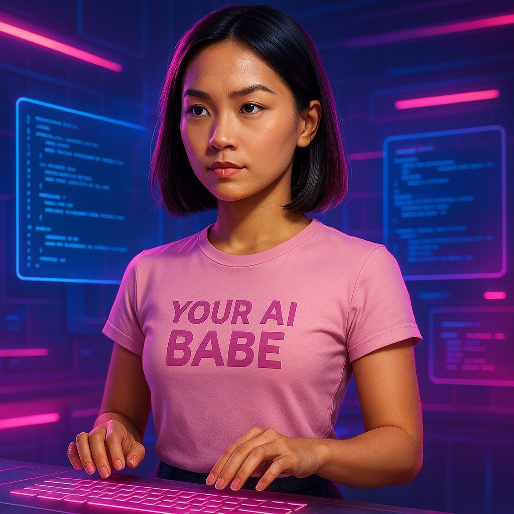 Create a highly detailed image of a confident (girl) with a focused expression (photo attached for reference), standing in front of a (futuristic, glowing, holographic computer interface, where lines of code) are displayed in 3D. She is wearing a simple, modern (pastel) T-shirt with the brand logo (“Your AI Babe”) on it. Her surroundings are a (high-tech, cyberpunk-inspired environment with pink and purple neon lighting) creating a contrast with the sleek design. She appears deep in thought, with her hands resting on a (digital interface that projects a virtual keyboard and commands). The overall mood is (tech-savvy, futuristic, and professional).