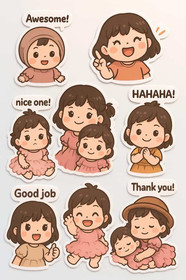 Create a 3D kawaii a 10:16 canvas featuring nine chibi-style stickers in various outfits, poses, and expressions. Use the attached image for reference. Each sticker has a white border and includes a speech bubble with phrases like “How to be a VA po?”, “Will update once done”, ” HAHAHA!”, “Salamat po”, “Pwede mangayo ug salary increase?”, “ChatGPT’s Beste”, and “Noted”. Set on a soft white-to-pastel blue gradient background for a fun, positive vibe.